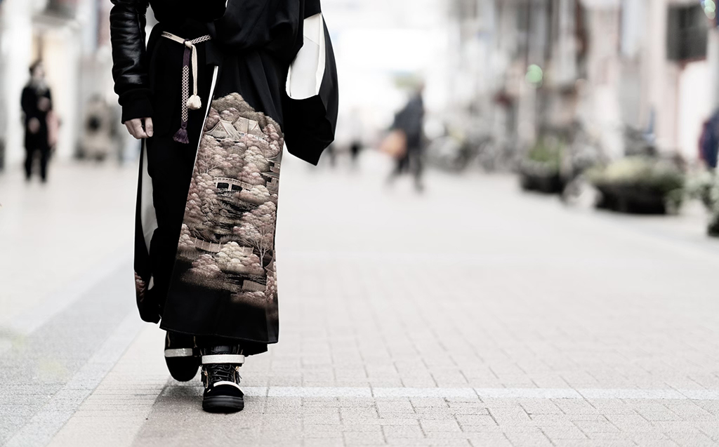 帯締めをアクセサリーに、下に着る長襦袢をライダースジャケットに変更し、大きな帽子を被りました。