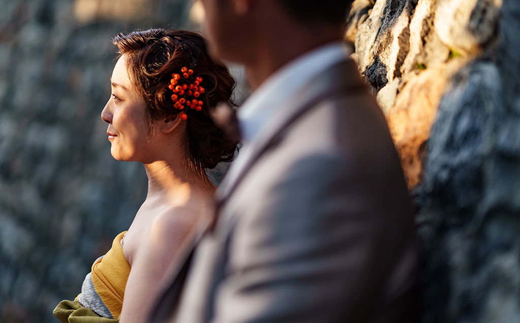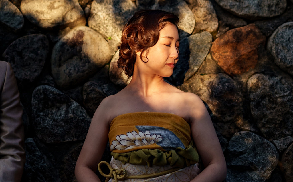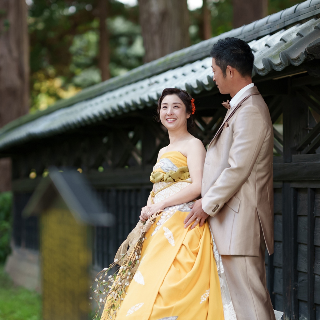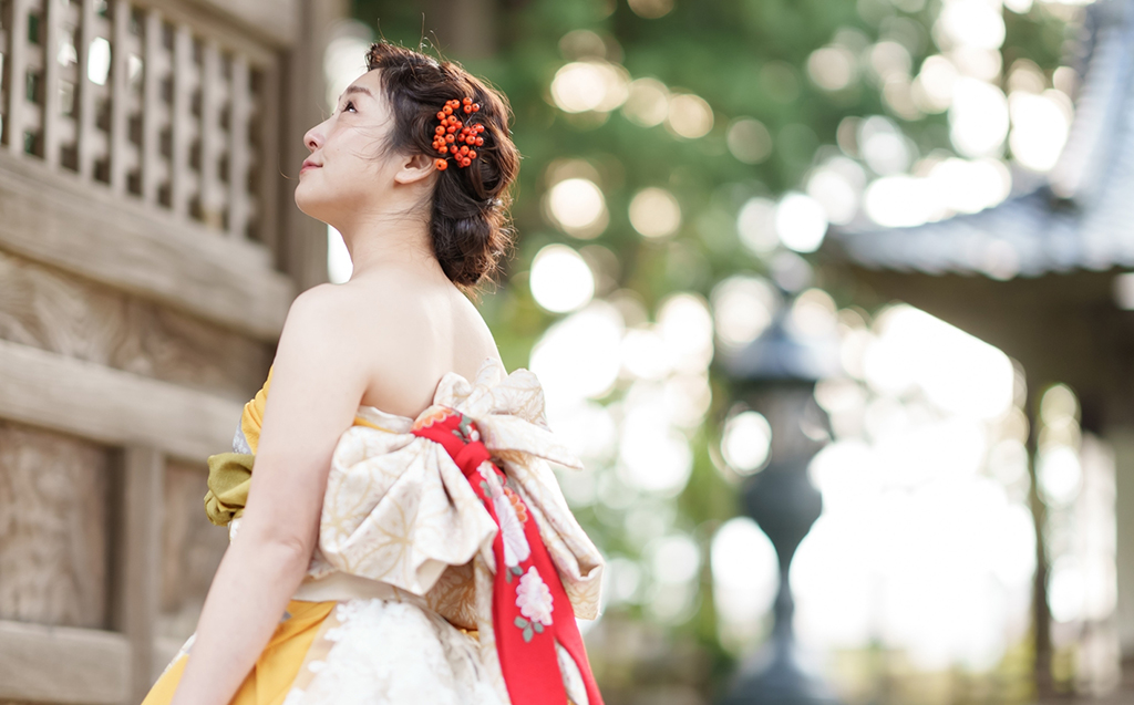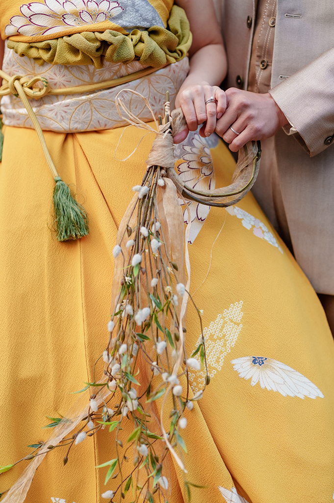 振袖をドレスに変えて、村上の情緒に溶け込むような独自のスタイルが完成しました。さらに、髪型にはレトロな雰囲気を取り入れ、ブーケや髪飾りもデザインし、全体を大人の魅力でまとめました。